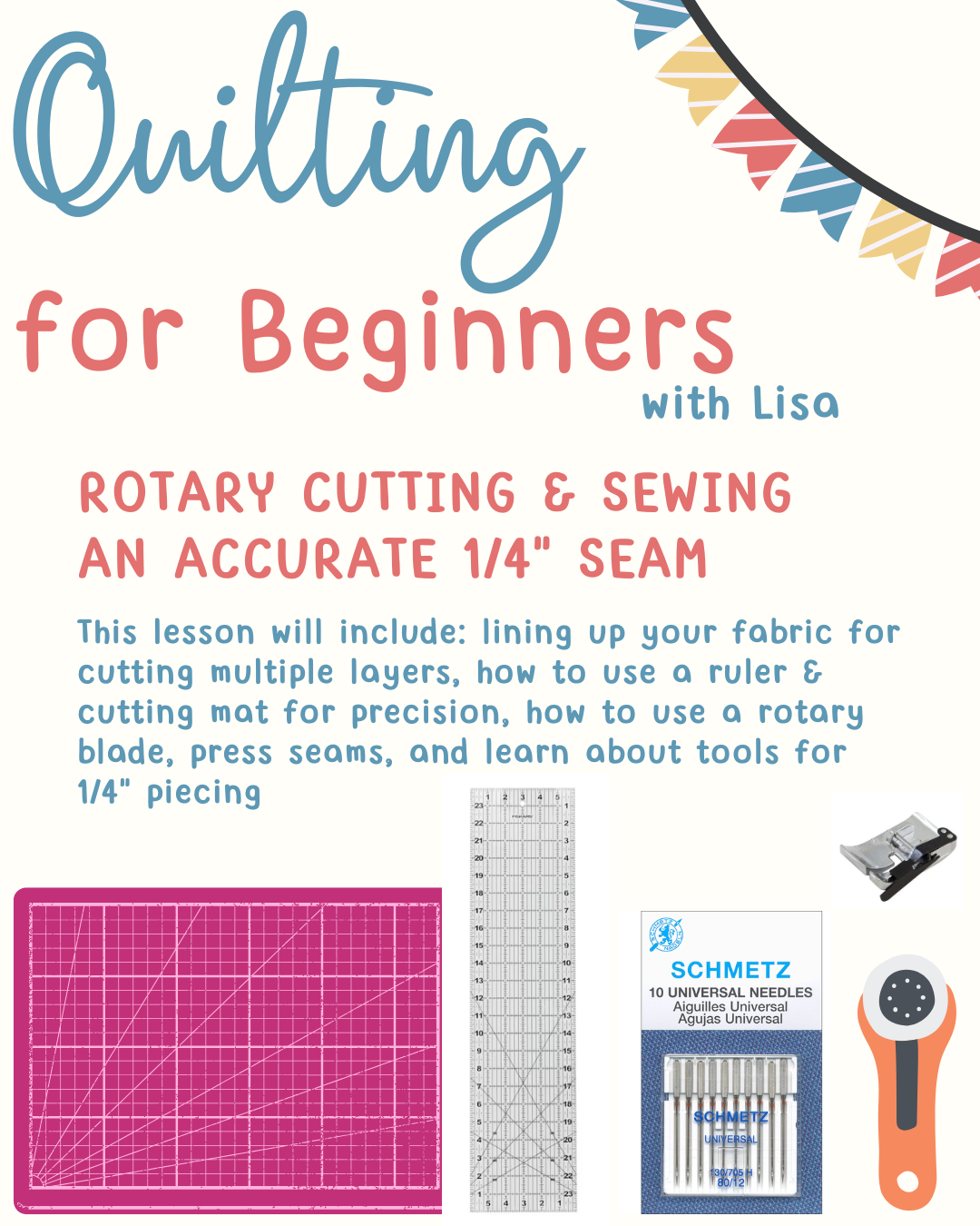 Rotary cutting is a way to quickly and accurately cut fabric pieces of varying sizes and shapes. This lesson will include: