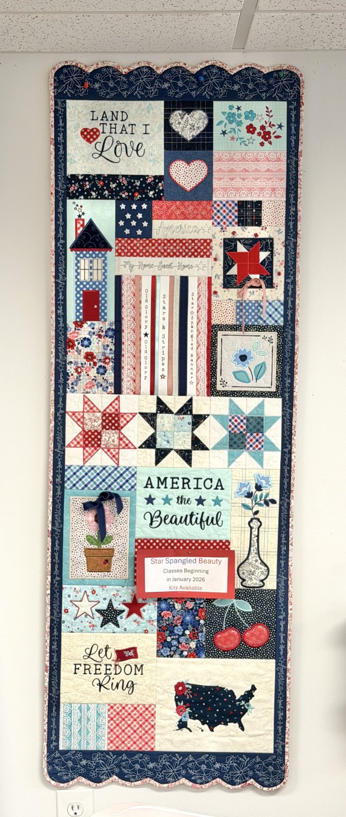 Star-Spangled Beauty is a 20 x 60” ladder quilt with an Americana theme. Stitch 8-point stars, a patchwork flag, and even vinyl frames for your favorite photos! Lace stripes and ribbon swirls add a uniquely feminine touch. With playful colors, delicate florals, and scalloped edges, Star-Spangled Beauty is a delightful tribute to the land you love! Cost of class is instruction only, students will need to purchase the fabric kit, design files, and embellishment kit. Class will meet 1-2 times a month until the project is complete.